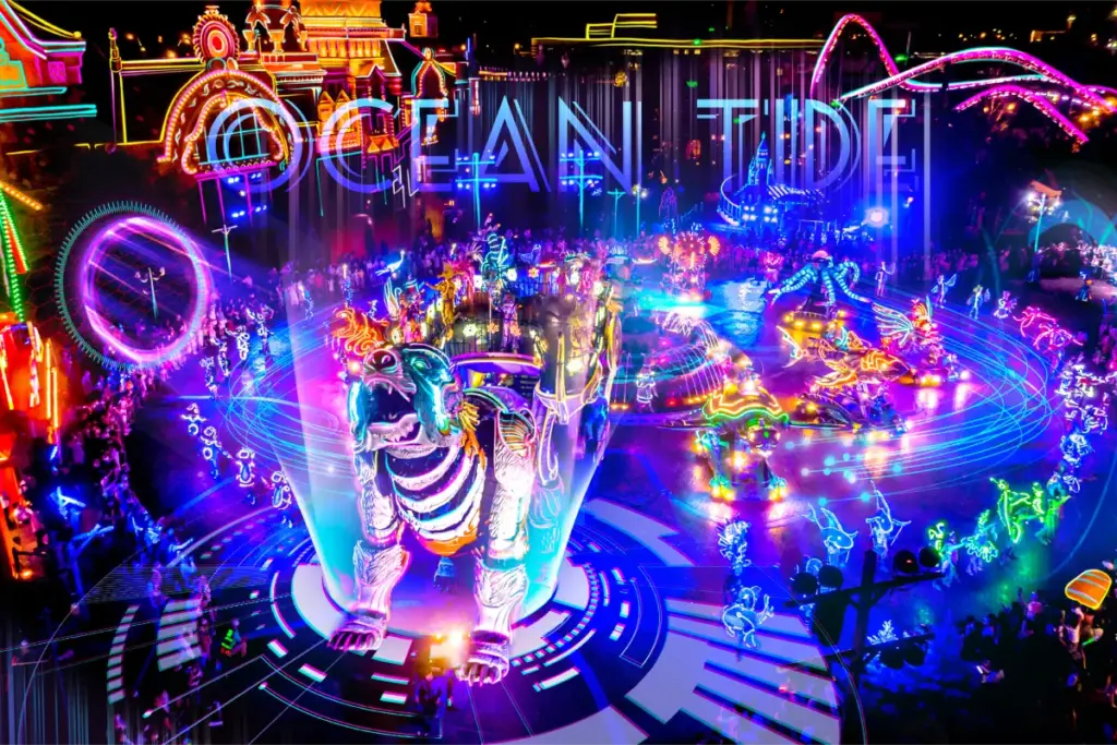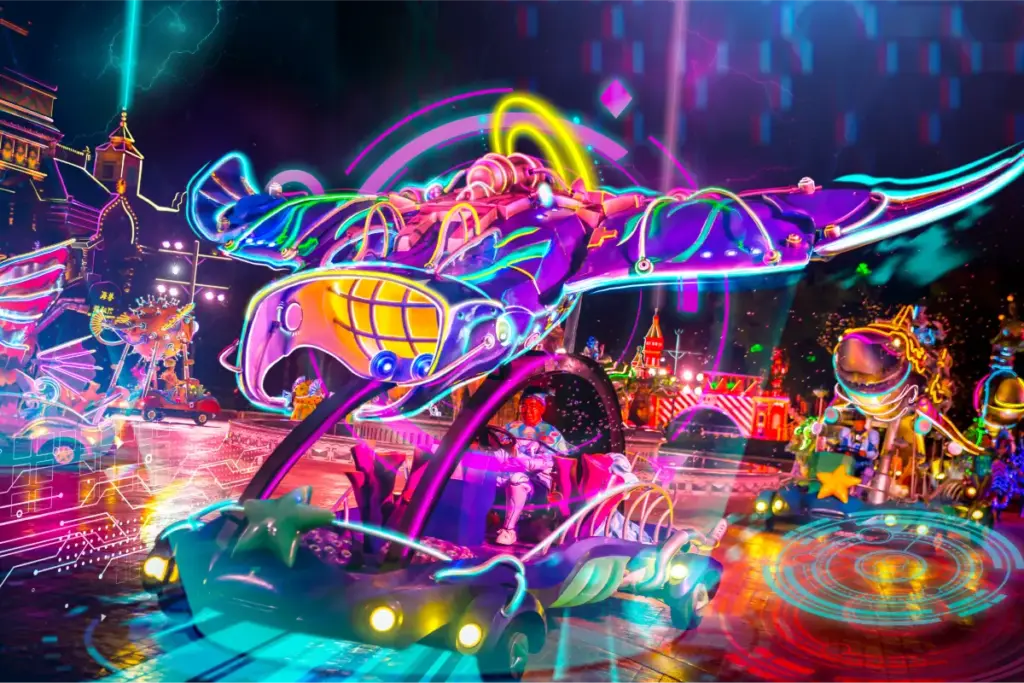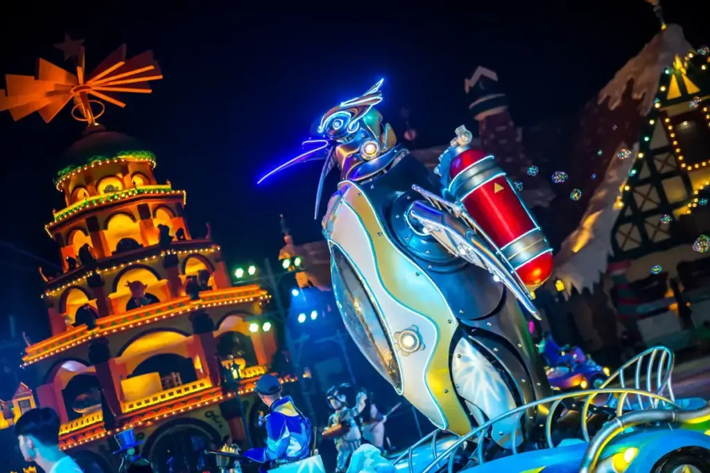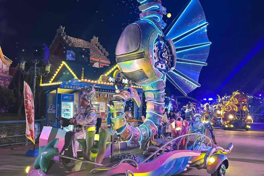 这场原创游行以十几个巨型机械怪兽为特色,总长度近 200 米,将动态故事情节与公园的建筑和环境相结合,带来神奇的日夜体验。.